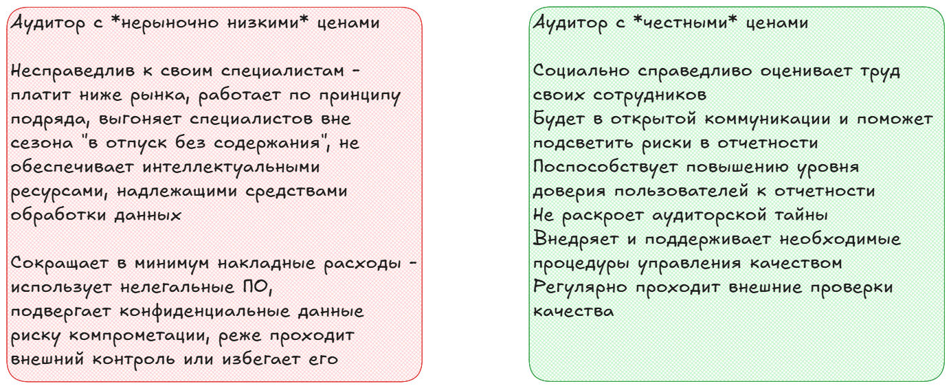 Добросовестные АК понимают невозможность конкуренции в таком виде деловых взаимоотношений, а клиентам “нерыночно дешевых” аудиторов следует взвесить риски и обоснованность такой экономии.